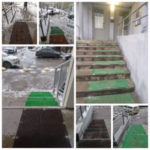 — Выполнен монтаж противоскользящих ковриков на ступени (ул. Егорова, 3, п.1; Павшинский б-р, 3, п.1; Подмосковный б-р, 11, п.2, 5, 6, 7; ул. Игната Титова, 7, п.1; ул. Спасская, 4, п.5, п.6, п.7);