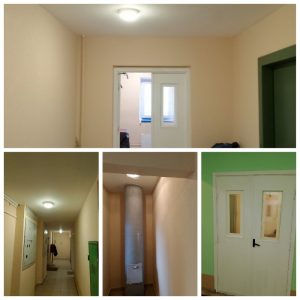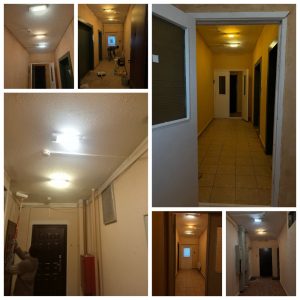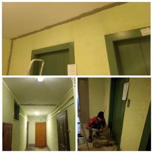 — Произведен косметический ремонт на этаже: демонтаж битой плитки и монтаж новой в лифтовом холле, частичная расчистка штукатурно – окрасочного слоя стен, потолков, оштукатуривание стен, потолков, окраска потолков водоэмульсионной краской, окраска стен водоэмульсионной краской с добавлением колера, окраска оконных рам и откосов, окраска дверного полотна (ул. Спасская, 8, п.1, эт.16);