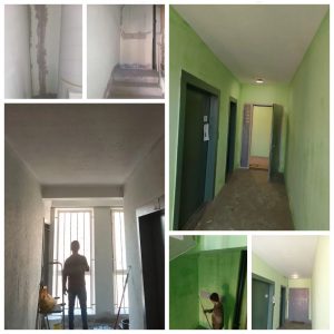 — Продолжается косметический ремонт подъезда: частичная расчистка штукатурно – окрасочного слоя стен, потолков, оштукатуривание стен, потолков, окраска стен и потолков (ул. Игната Титова, 7, п.2, эт. 16, 15, 14, 13, 12)