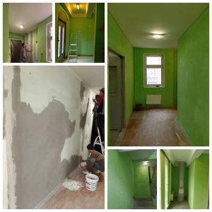— Продолжается косметический ремонт подъезда: частичная расчистка штукатурно – окрасочного слоя стен, потолков, оштукатуривание стен, потолков, окраска стен и потолков (ул. Игната Титова, 7, п.2, эт. 4, 3, 2);